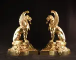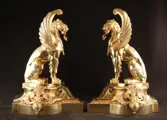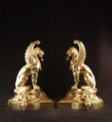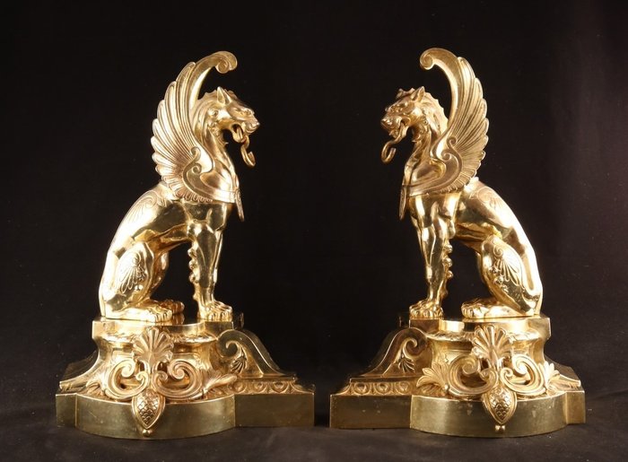 Paar uitzonderlijk fraaie grote antieke bronzen vuurbokken- of chenets in de vorm van twee vervaarlijk uitziende griffioenen.