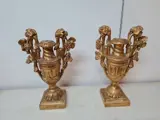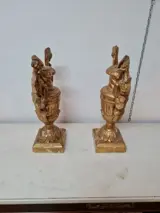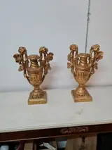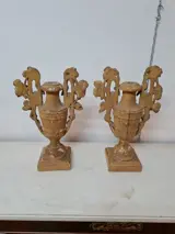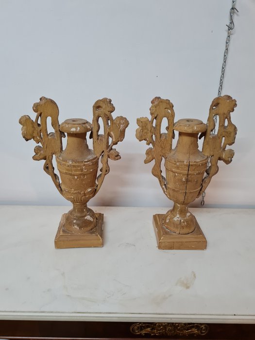 Paar potten met palmhouders in gebeeldhouwd populierenhout verguld met bladgoud uit het begin van de jaren 1800. Het paar artefacten is fijn gesneden in de vorm van trossen en druivenbladeren op de handvatten, met pilasters in het centrale deel en in de vorm van acanthusbladeren op de basis. Op een van hen in het bovenste deel van het handvat aan de linkerkant is er een klein gebrek zoals op de foto te zien is. De potten meten aan de basis 14,5 x 14,5. H 45. L 27. Gewicht ongeveer 1,8 kg per stuk