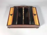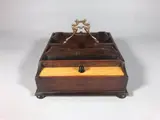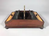 Eikenhouten pennenbakje met diverse vakken, twee deksels en een messing greep.