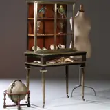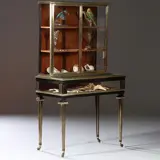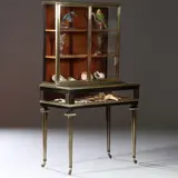 De Bovenkast staat op een vitrinetafel met een omhoog scharnierende klep. Het geheel op vier gedraaide poten met ingelegde messing cannelures.