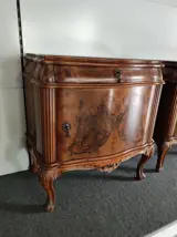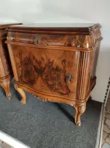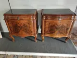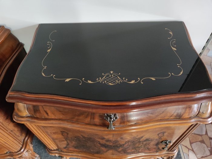 Prachtig paar antieke nachtkastjes, nooit gerestaureerd en in uitstekende staat, gebogen aan de zijkanten met notenhout. Afmetingen: hoogte 62 cm, breedte 60 cm, diepte 37 cm. Zwart glas opaline blad met sierlijke decoratie.
