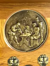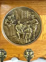 Deze prachtige zeldzame antieke eiken kapstok met drie bronzen platen van een middeleeuws tafereel is werkelijk een lust voor het oog.
