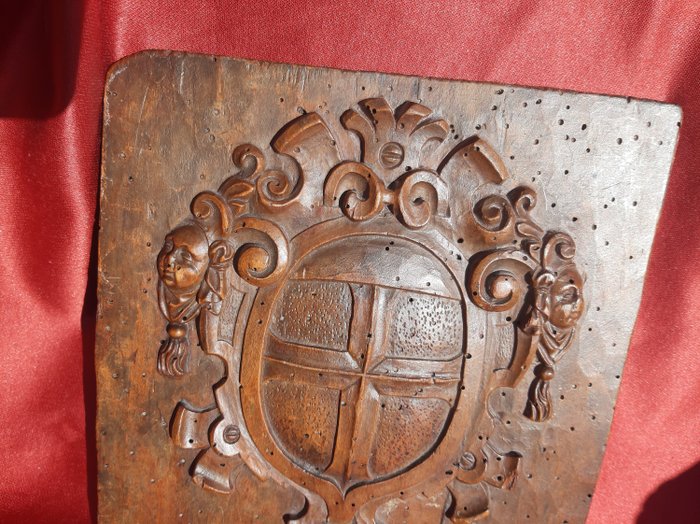Gebeeldhouwde notenhouten tablet die het wapen van de adellijke familie voorstelt met kruis en twee gezichten. Renaissance eind 1500. Afmeting 18x19 cm. Houtworm in hout dat niet meer actief is.