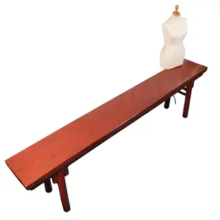 Chinees lakwerk tafel een schitterend eenvoudige en zeer lange wandtafel op 4 poten. In prachtig verouderde rode lak.