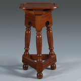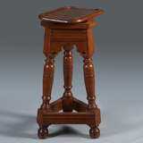 Zeer solide eikenhouten atelierbok met een rechthoekig verdiep bovenblad en afgeronde hoeken. Het onderstel bestaat uit een drietal gedraaide poten die ietsje schuin naar buiten staan. Onderling zijn deze verbonden met een sport.