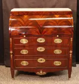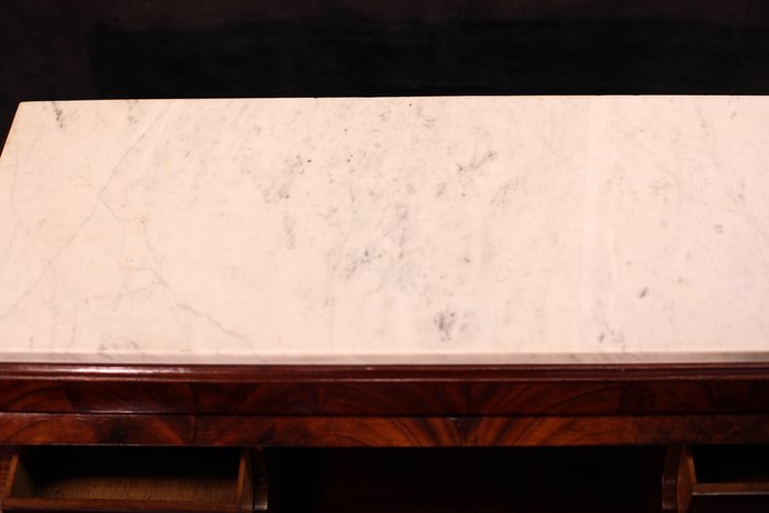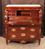 Antieke mahoniehouten Louis Seize-stijl secretaire met 3 laden en afgewerkt met latoenkoperen beslag, 19e eeuw, opstand met marmer,later periode, ingelegd met kalfsleer