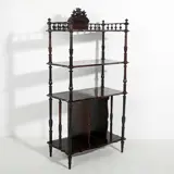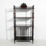 Romantische etagère, in donker hout, blad omlijst door een rooster, versierd met gedraaide kolommen, poten verbonden door planken met houders voor schijven of tijdschriften. Portugees. XIX eeuw. Afmetingen: 142x70x38 cm. In uitstekende staat (het werd op de juiste manier teruggevonden, met respect voor de materialen en de vorm van het meubilair).