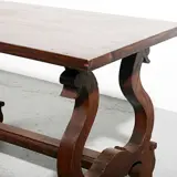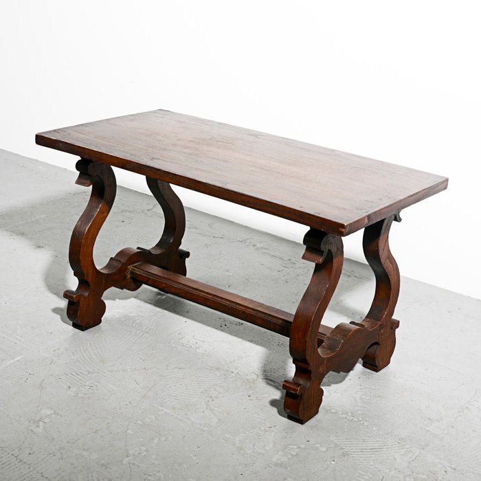Rustieke tafel in kastanjehout, holle poten verbonden door een dwarsstuk. 52x90,5x47 cm. In goede staat.