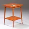 Hollands vierkant satijnhouten bijzettafeltje met onderblad. Staand op vier naar buiten uitstaande taps toelopende pootjes. De pootjes zijn ingelegd met biezen. De bladen hebben elk een gevierendeeld binnenvlak op paroon gespiegeld met een omlijning van ingelegde biezen van palm of hulst met ebben. Daaromheen een strekrand van eveneens satijn. De regels onder het bovenblad hebben verglijkbare biezen. Aan de bovenkant van de poten een donker strak sierlijstje van Cubamahonie.