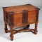 Antieke Zweedse kist op gedraaid onderstel en rijk voorzien van ijzerbeslag en twee ijzeren grepen. Plat deksel met een rechte rand.