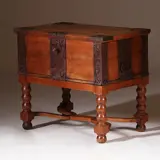 Antieke Zweedse kist op gedraaid onderstel en rijk voorzien van ijzerbeslag en twee ijzeren grepen. Plat deksel met een rechte rand.