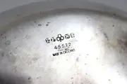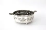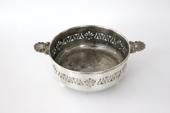 Vintage verzilverde art deco schaalhouder met prachtige schelpvormige handvatten en opengewerkte versieringen, en drie ronde voetjes. Het is gemaakt in Engeland door Barker Brothers of Birmingham, zoals aangegeven door het klaverblad op de bodem gestempeld, en dateert uit het begin van de twintigste eeuw. Een zeldzaam en verzamelbaar stuk.