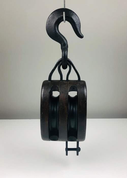 Een dubbele scheeps catrol. Uit de 20e eeuw. Het ijzer is een mooi smeedwerk met een originele haak erbij.