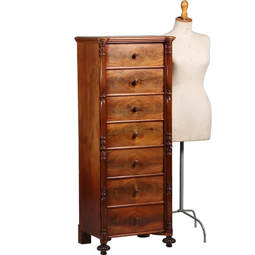 Mahoniehouten laat biedermeier ladekast of semanier op z’n Frans (vanwege de 7 laden, voor elke dag van de week ééntje) De laden worden met een zogenaamde “Wellington” afgesloten, de rechtse zijstijl kan met een sleutel worden ontgrendeld wordt vervolgens weggedraaid en alle laden zijn te openen.