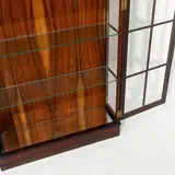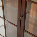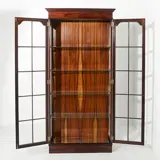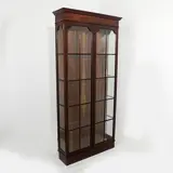 Vitrinekast in mahoniehout en andere materialen, met uitkragend cymatium, met afgeschuinde glazen deuren en glazen zijkanten, met 5 glazen planken. Afmetingen: 182x87x25,5 cm. In goede staat.