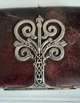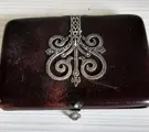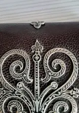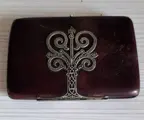 Bruin lederen sigarettenkoker, met geometrische tekeningen in zilverreliëf, die bloemmotieven vormen.