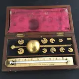 Een complete antieke Sikes Hydrometer set met alle negen messing gewichten en de eindkap individueel gemarkeerd met het serienummer 12819