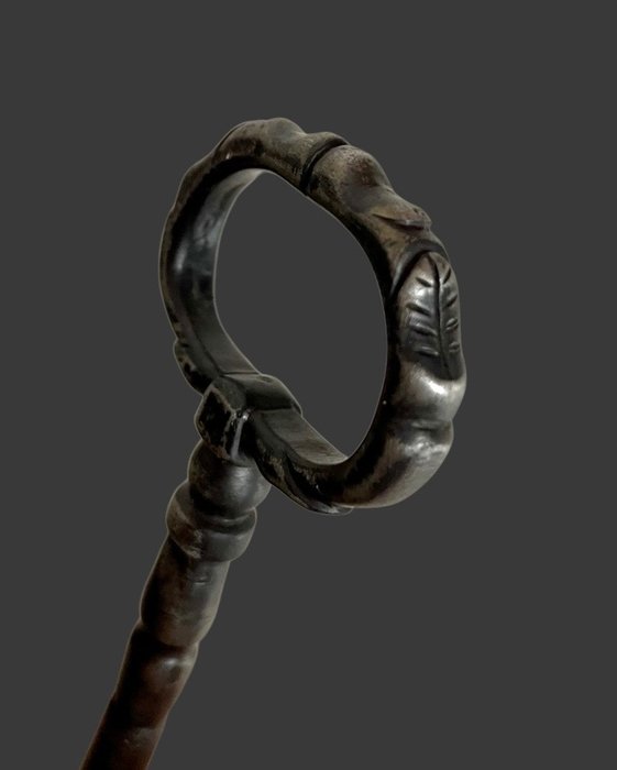Ovale kop met versieringen. Hals met twee ringen gevolgd door kolomstijl. Zadelpen met cazes en hol met een plat bit met vier tanden en vier sockets. Goede conservering, met brede patina. 14,5 cm.
