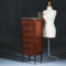 Smalle hoge Franse mahonie ladenkast in Louis Sieze stijl periode eind 19 e eeuw, kleine opstaand railinkje in messing rond het marmer blad. Het blad heeft op de voorhoeken een ronde uitstulping waarmee het blad de contouren van de kast volgt. De zijstijlen zijn namelijk ronde naar buiten geplaatste zuilen. De zuilen zijn voorzien van cannelures en gaan over in de ronde gedraaide tapse poten. De achterpoten zijn identiek aan de voorpoten.