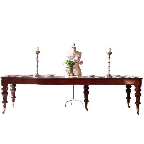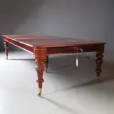 Mahoniehouten Victoriaanse eetkamertafel type pull out table daarbij 4 inlegbladen met doorlopende onderranden. De tafel staat op vijf fraai gevormde poten met messing wielen. De middelste poot kan, wanneer de tafel is ingeschoven ook worden weggenomen.