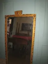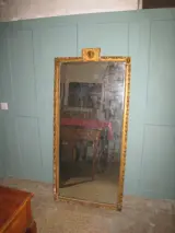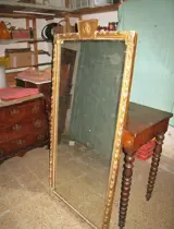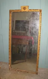 Te koop een prachtige grote spiegel, originele kwikspiegel, originele lijst in hout en verguld gips met bloemmotieven, reliëf cymatium met afbeelding van het gezicht van de god Hermes (Mercurius). Er zijn kleine defecten en slijtage na verloop van tijd. Uniek stuk van grote waarde, meet 163*75, dikte 7cm