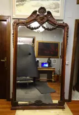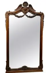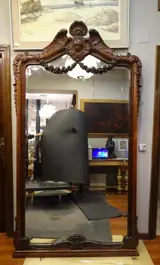 Spectaculaire Franse spiegel, SXIX, Napoleon III, gemaakt van massief notenhout en fijn gesneden. Het is een ongelooflijk stuk van grote afmetingen, het heeft een hoogte van 2,26 m en een breedte van 1,25 meter. Het heeft een kuif, met twee symmetrisch geplaatste vleugels, die het lichaam van een duif omlijsten. In andere delen van de lijst heeft het plantversieringen in de vorm van rollen en bovenaan een grote bloemenslinger. Aan de basis zijn er ook meer siermotieven. Het heeft een prachtige grootte, zeer goed gemaakt. Het is een geweldige spiegel om hem te laten staan, tegen de muur te leunen of te hangen, als je een hoog plafond hebt. Bovendien wordt het bewaard met de originele kleur van het hout, maar er kan een kleur worden aangebracht... dat wil zeggen, het heeft veel potentieel, omdat het kan worden verlicht en gestript, of zelfs verguld.