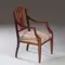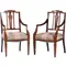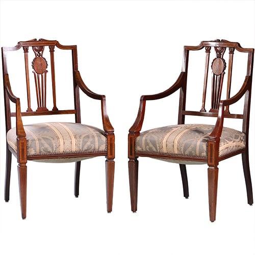 Opzoek naar een bijzonder stel armstoelen met prachtige det stel van 2 mahonie armstoelen met een zeer fraai opgewerkte rugleuning met fijn steekwerk en gedetailleerd inlegwerk in o.a een prachtige medaillon met bloemmotieven, op elegant tapse poten,