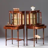 Stel van twee identieke mahoniehouten vitrinemastjes, de smalle vitrines met elk vijf kleine ruitjes staan op een iets uitspringende ondertafel met een lade en een gecontourneerd onderblad. Het geheel op strakke tapse pootjes.