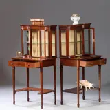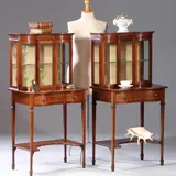 Stel van twee identieke mahoniehouten vitrinemastjes, de smalle vitrines met elk vijf kleine ruitjes staan op een iets uitspringende ondertafel met een lade en een gecontourneerd onderblad. Het geheel op strakke tapse pootjes.