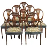 Stel van 8 Engelse Hepplewhite stoelen waarvan 2 met armleuningen. De ovale rugleuningen met een fijn gedetailleerde opengewerkte rugstijl. In het midden daarvan een fraai ingelegde ovaal met daarin een klassieke vaas met oren. De achtepoten uitgebogen de voorpoten taps met een klein taps blokpootje. De zittingen met een geborduurde zitting met een staand boord van blauw velours.