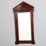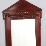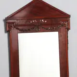 Hollandse neoclassicistische mahonie spiegellijst met uitkragende hoeken, formaat kleine schouwspiegel, met een strak timpaan en in de bovenregel prachtig gesneden guirlandes, een feeërieke strik en twee bungelede kwastjes.