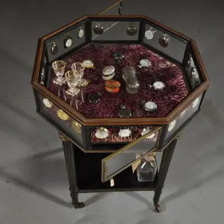 Een achtkantige vitrinetafeltje met twee kleine masief bronzen beglaasde afsluitbare deurtjes aan de tegenover elkaar liggende kanten. Op een onderstel van vier gedraaide zwart gepolitoerde houten taps-toelopende poten met bronzen cannelures. Daartussen een blad met bronzen opstaande randje. Staand op kleine wieltjes en met bronzen ornamenten onder het vitrine deel. De vitrine is gemaakt van massief brons met bronzen profielen, door de tijd prachtig gepatineerd en zeer robuust. De bodem van de vitrine bekleed met een paarse zeer driedimensionale stof die bijna aandoet als koraal. De horloges of andere collectables vlijen zich hier gewillig op neer.