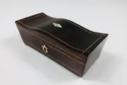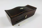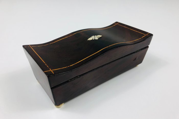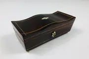 Origineel lepeldoosje met een gegolfde deksel ingelegd met een bies van hout. De bovenkant heeft een wieber vorm van been en het slotplaatje is ook van been. Op vier pootjes van been waarvan 1 afwijkend is.Met originele spiegel aan de binnenkant.