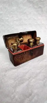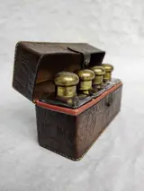 Een set van 4 geurflesjes met messing dop in een lederen etui.