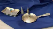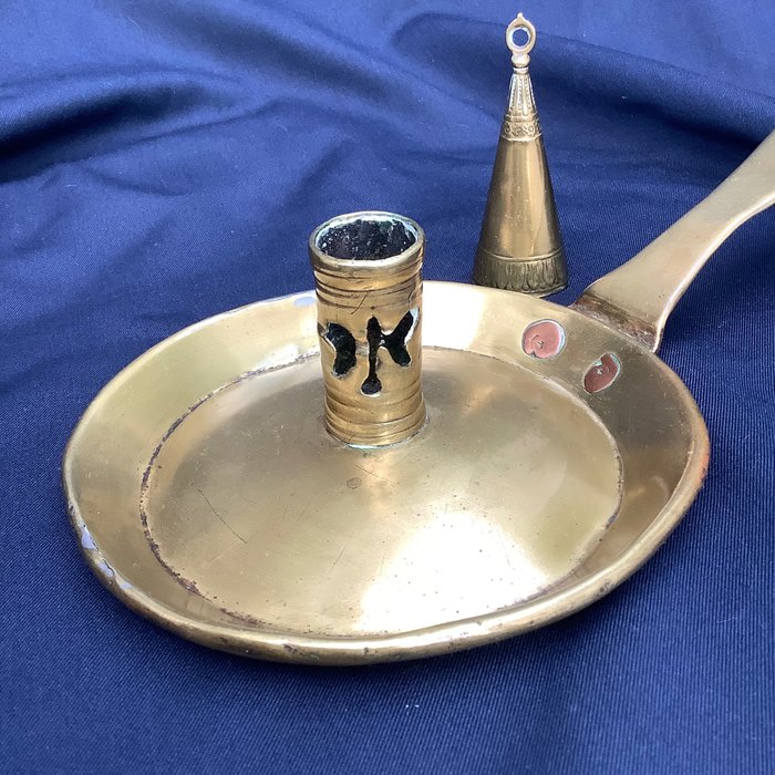 Ronde geelkoperen blaker uit Nederland. Is geslagen en geklonken.