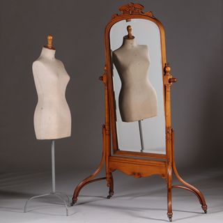 De vorm van de spiegel, rechthoekig met een D-end als bovenkant, is typisch Engels, net als de constructie van de achterwand en het draai- en steekwerk, de gebogen poten doen aan Thonet denken. Hij kreeg in Engeland veel navolging vanaf het einde van de 19 e eeuw toen ook daar het stoombuigen in ontwikkeling kwam.