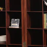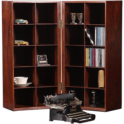 Engels mahoniehouten tweeledig scharnierend vakkenkastje. Geschikt om op een (werk)tafel of bureau te plaatsen. Maar ook op de vloer als een “zuil” en handige plek om al die CDtjes onzichtbaar in op te bergen. Mooi eenvoudig meubelmakerswerk in massief mahonie.