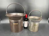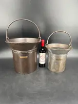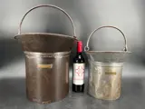 Schitterende antieke maatbekers van 10 liter en 5 literl met ijkmerken in de rand.