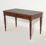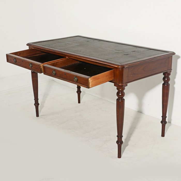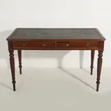 Bureau in Victoriaanse stijl, met 2 lades, met gele metalen handgrepen. Top bekleed met gegraveerd leer. Afmetingen: 77x126x67 cm. In goede algemene staat (met enige slijtage veroorzaakt door tijd en gebruik, maar die geen afbreuk doet aan de schoonheid, vorm en integriteit van het meubel).