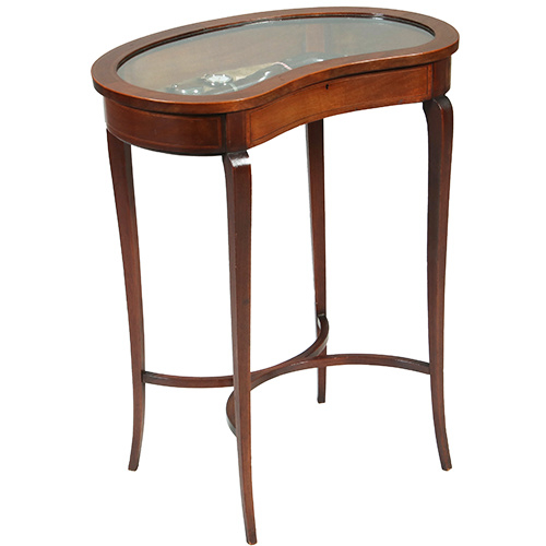 Engelse mahonie vitrinetafel op vier gebogen pootjes die onderling verbonden zijn met een kruis dat uit halve cirkels bestaat. Het deksel, de onderrand de pootjes en het kruis zijn met verschillende biesjes ingelegd. Bekleed met het oorspronkelijke iets verouderde grijsgroene velours.