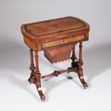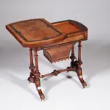 Rijk uitgevoerde en prachtig ingelegde Victoriaanse Speeltafeltje en werktafeltje ineen. Het wortelnoten gefineerde bovenblad ingelegd met een ebbenhouten band met daarin een slingerende bladrank in hulsthout waarmee ook de inleg is afgezet in dunne lijntjes.
