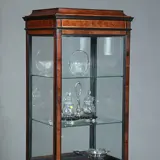 De vitrine staat op vier elegante tapse pootjes en is bekroond met een inspringende geprofileerde lijst. Het mahonie van de lade en het fries zijn rondom prachtig contrastrijk ingelegd met satijnhout.