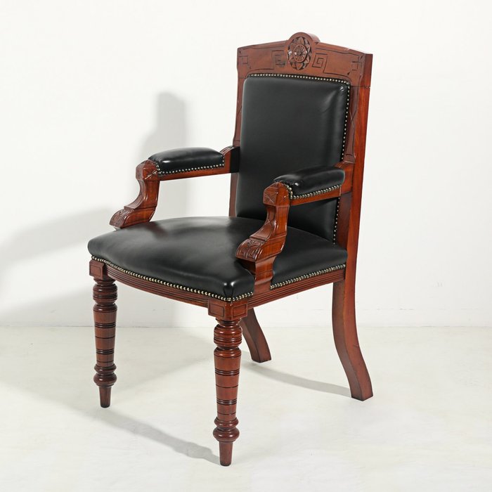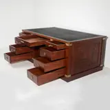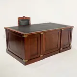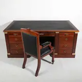 Bureau in Engelse stijl, van fijn mahoniehout, rechthoekig blad met met leer bekleed schrijfblad, met twee laden aan de voorkant, geel metalen beslag, met fauteuil. Bureau: 75x180x105 cm. Stoel: 98x56x50 cm. In goede staat (het is op de juiste manier hersteld, met behoud van de originele materialen en vormen van het meubilair).