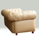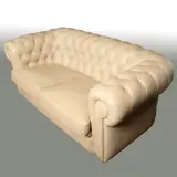 Crème kleurige 2,5-zits Chesterfield bank met twee zitkussens met een piping in kleur en een glad border. Rond lopende hoeken geven de bank een minder massieve uitstraling.