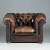 Degelijke zetel in oude kleur en met passende gebruikssporen. Met een goede poetsbeurt kan deze chesterfield een egalere en in het geheel wat donkere uitstraling krijgen. Dit kan onze restaurateur natuurlijk voor u doen. Ook kan de zetel met een lichte was worden gepoetst, het kleurverschil en daarmee de oude look blijft dan sterker aanwezig. Prijs inclusief genoemde zorg, transport en plaatsing.
