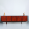 Dressoir in Palissander met drie deuren, twee laden en een grote bar, uitgevoerd door Fristho. Buitengewoon gaaf exemplaar, in de authentieke lak. Originele glasplaat in de bar. Alle verdiepte houten grepen onbeschadigd.