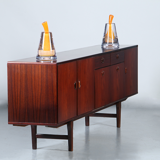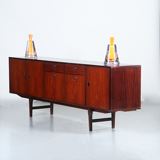 Dressoir in Palissander met drie deuren, twee laden en een grote bar, uitgevoerd door Fristho. Buitengewoon gaaf exemplaar, in de authentieke lak. Originele glasplaat in de bar. Alle verdiepte houten grepen onbeschadigd.