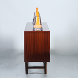 Ook de binnenzijde is fraai en fijn afgewerkt; Achter de deuren prachtig palissander schappen en bodems tegen een fijn contrasterende bijna witte achterwand. In de bar eveneens zo’n mooie donkere palissander bodem, daarboven een smal glazen planchet van frost of byzantijns glas en ook hier een bijna witte achterwand.