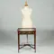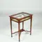 Het rechthoekige mahoniehouten tafelvitrinetje heeft gedetailleerde biezen van hulst langs boenblad en onderblad. Met glas aan 5 kanten is er altijd voldoende licht aanwezig om een goed zicht op de uitgestalde herinneringen te hebben. Met afsluitbaar en opklapbaar deksel, het geheel op een elegant onderstel van vier tapse poten, onderling verbonden door boogvormige regels die samenkomen onder een klein rechthoekig onderblad. De tapse pootjes eindigen in een eveneens taps blokvoetje.