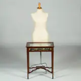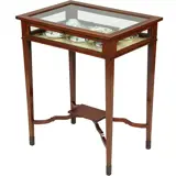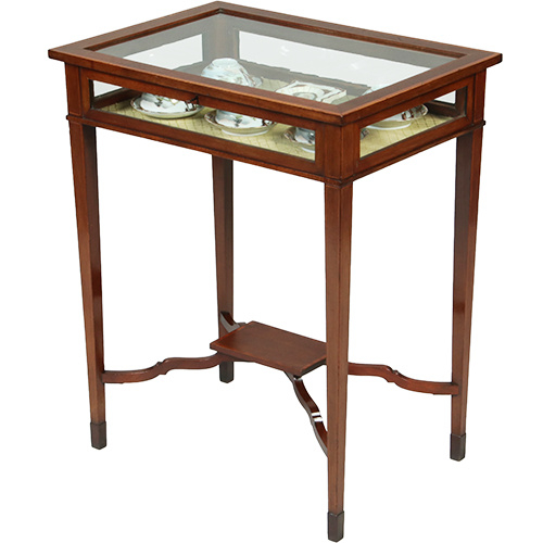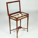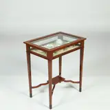 Het rechthoekige mahoniehouten tafelvitrinetje heeft gedetailleerde biezen van hulst langs boenblad en onderblad. Met glas aan 5 kanten is er altijd voldoende licht aanwezig om een goed zicht op de uitgestalde herinneringen te hebben. Met afsluitbaar en opklapbaar deksel, het geheel op een elegant onderstel van vier tapse poten, onderling verbonden door boogvormige regels die samenkomen onder een klein rechthoekig onderblad. De tapse pootjes eindigen in een eveneens taps blokvoetje.